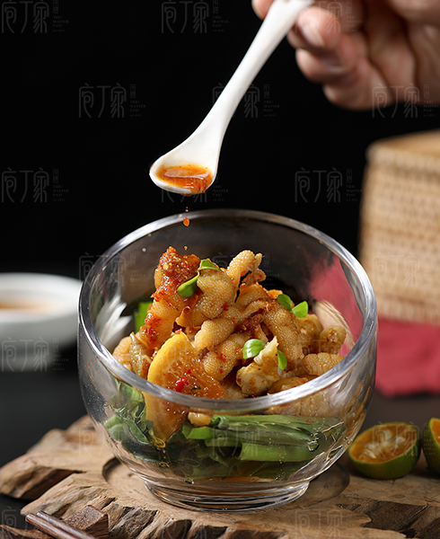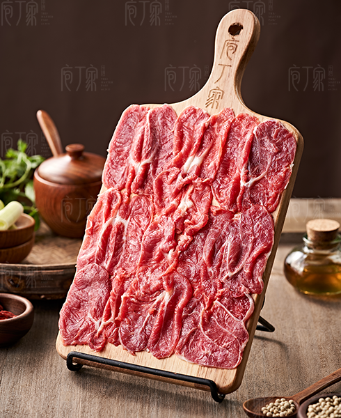 選用上等牛前腿肌腱肉,位于肩胛骨里側,有粗筋通過,肉質酥脆,汁水甜鮮。