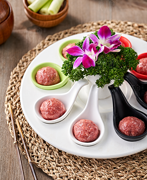 選用上等牛肉,手工精打40分鐘制成,肉泥細膩鮮嫩,Q彈勁爽,